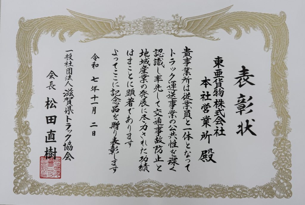 11月2日 第10回 滋賀県交通安全フェアにおきまして、滋賀県トラック協会 優良事業所の部にて表彰を受けました。